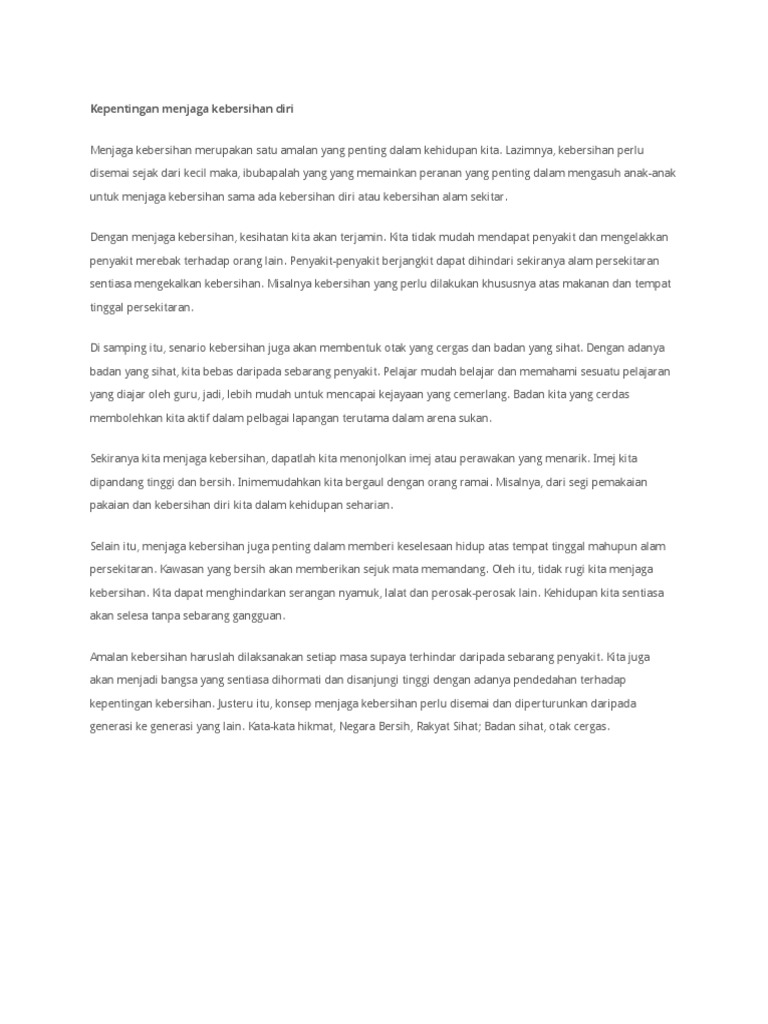 Kebersihan diri amat penting untuk kesihatan kita. Kepentingan Menjaga Kebersihan Diri Dalam Kehidupan Seharian. Penulisan karangan yang baik memerlukan latihan yang banyak dan efektif.